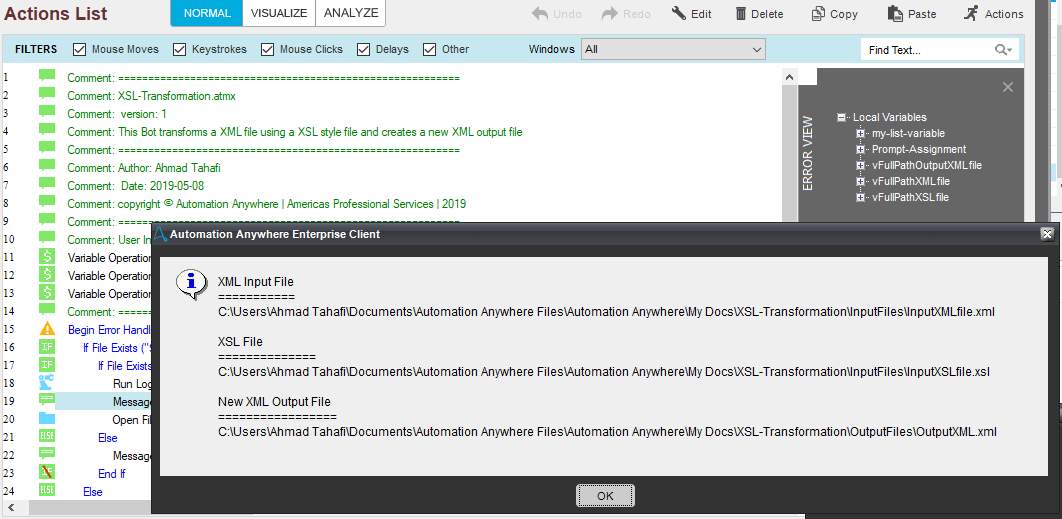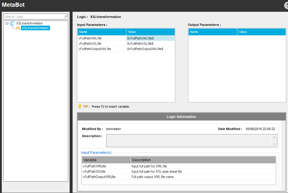 - This Bot transforms a XML file using a XSL style file and creates a new XML output file