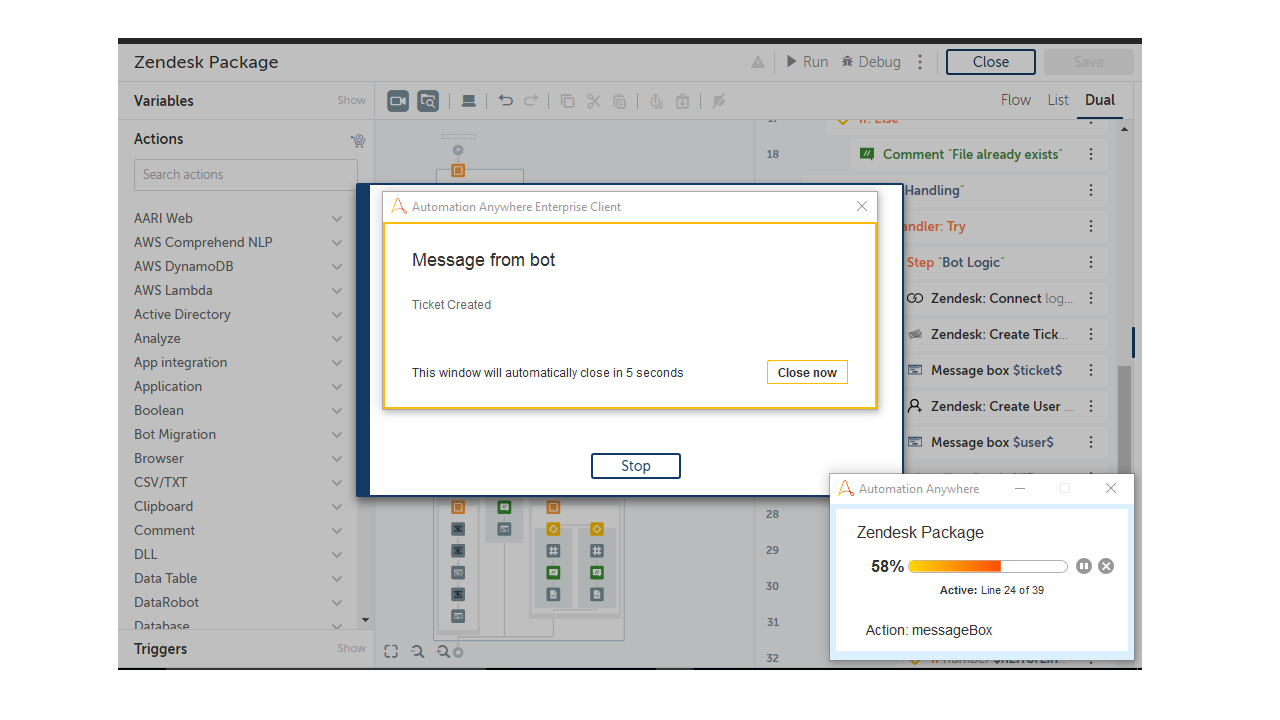 3. Create Ticket - For creating ticket in Zendesk account. Reads subject and body of the ticket from user. Use same session name as used in the respected connect action. Returns the result of user creation in a string variable.